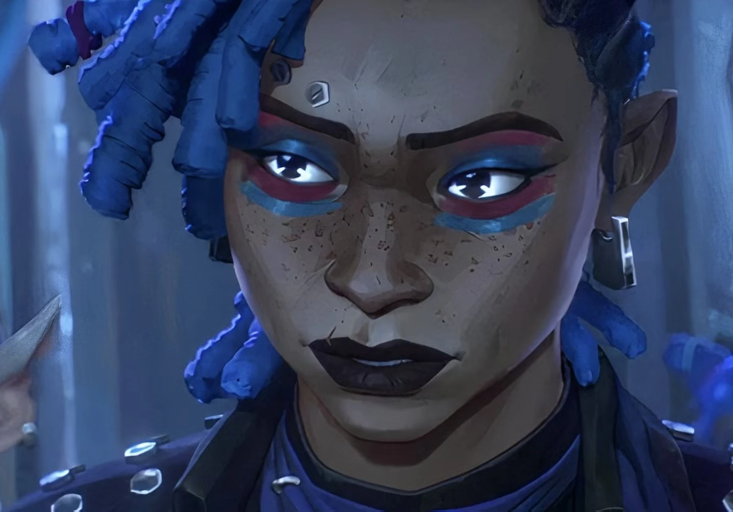 Gert is muscular and stocky, a similar body type to Vi. She has warm brown skin that’s littered with freckles. She has a scar on her upper lip, two silver bolt-like eyebrow piercings, and blue side-swept dreadlocks. She wears blue and pink eyeliner in honor of Jinx, and dark purple lipstick.