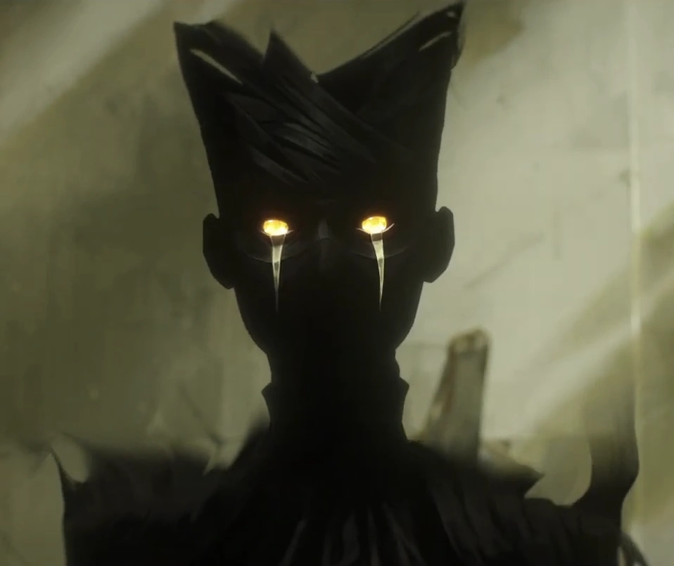 Her disguised form consists of a black ghastly body, with a black head piece and piercing yellow-orange eyes, underneath her eyes is a stripe of pale yellow. Her form extends to a long black skirt that has black cloud-tendrils seeping out of it. Her fingers are the only exposed body part, being fair-colored.